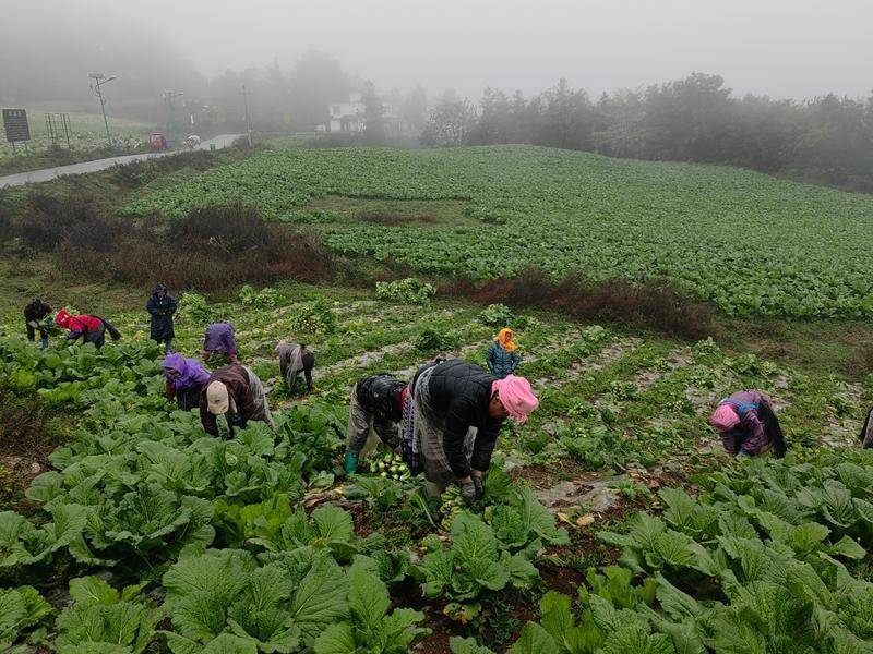 经过3个多月的生长,海雀村蔬菜基地里的青菜在初冬迎来了第二个丰收季。下午两点过,雾蒙蒙的蔬菜基地里下起了毛毛雨,湿冷刺骨,10多名群众却不为所“冻”,忙着收割蔬菜。